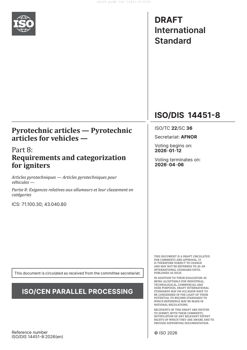 prEN ISO 14451-8 is a draft published by the European Committee for Standardization (CEN). Its full title is "Pyrotechnic articles - Pyrotechnic articles for vehicles - Part 8: Requirements and categorization for igniters (ISO/DIS 14451-8:2026)". This standard covers: ISO 14451-8:2013 specifies the types and order of tests to be applied to the igniter and sets out the acceptance criteria and means of categorization. ISO 14451-8:2013 applies to type tests. ISO 14451-8:2013 is not applicable to articles containing military explosives or commercial blasting agents except for black powder or flash composition.