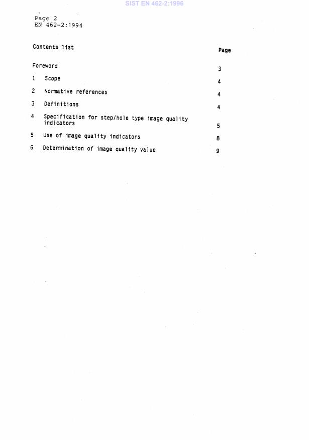 EN 462-2:1994 is a standard published by the European Committee for Standardization (CEN). Its full title is "Non-destructive testing - Image quality of radiographs - Part 2: Image quality indicators (step/hole type) - Determination of image quality value". This standard covers: This part 2 of the standard specifies a device and a method for the determination of the image quality of radiographs. Other devices are the subject of parts 1 and 5 of the standard.