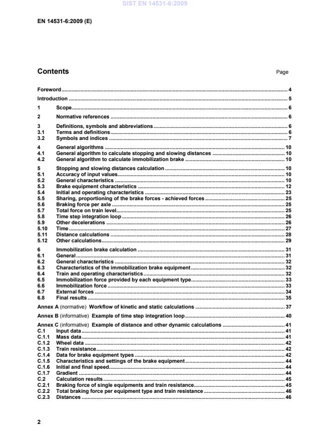 Example of distance and other dynamic calculations . 41C.1Input data . 41C.1.1Mass data . 41C.1.2Wheel data . 42C.1.3Train resistance . 42C.1.4Data for brake equipment types . 42C.1.5Characteristics and settings of the brake equipment . 44C.1.6Initial and final speed. 44C.1.7Gradient . 44C.2Calculation results . 45C.2.1Braking force of single equipments and train resistance . 45C.2.2Total braking force per equipment type and train resistance . 46C.2.3Distances . 46SIST EN 14531-6:2009