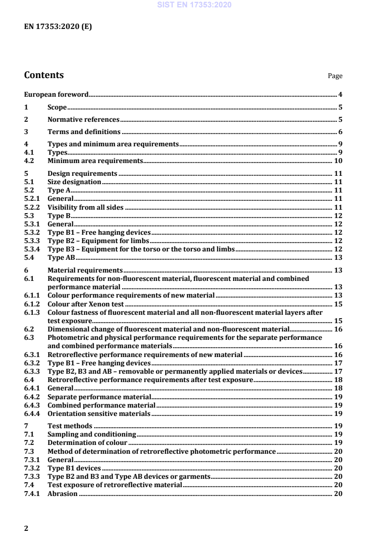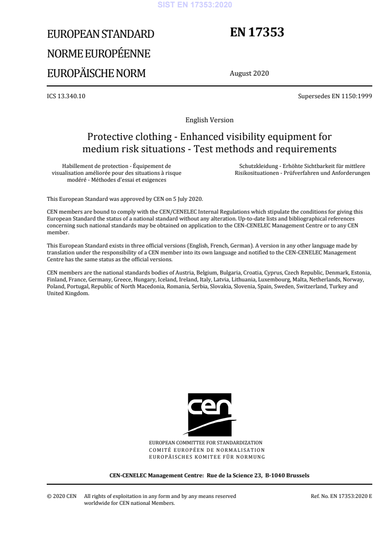 EN 17353:2020 is a standard published by the European Committee for Standardization (CEN). Its full title is "Protective clothing - Enhanced visibility equipment for medium risk situations - Test methods and requirements". This standard covers: This document specifies requirements for enhanced visibility equipment in the form of garments, or devices, which are capable of visually signalling the user’s presence. The enhanced visibility equipment is intended to provide conspicuity of the wearer in medium risk situations under any daylight conditions and/or under illumination by vehicles headlights or searchlights in the dark. Performance requirements are included for colour and retroreflection as well as for the minimum areas and for the placement of the materials in protective equipment. This document is not applicable to: - high visibility equipment in high-risk situations, which is covered in EN ISO 20471 (for further information concerning risk situations, see Annex A); - visibility equipment specifically intended for the head, hands and feet, e.g. helmets, gloves and shoes; - equipment integrating active lighting, e.g. LEDs; - visibility for low-risk situations.