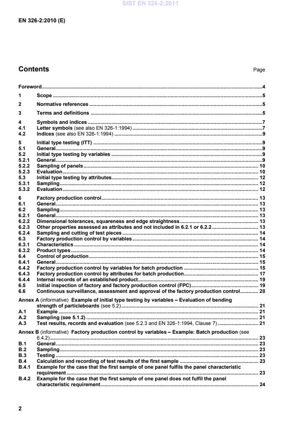 Factory production control by variables – Example: Batch production (see 6.4.2) . 23B.1 General . 23B.2 Sampling . 23B.3 Testing . 23B.4 Calculation and recording of test results of the first sample . 23B.4.1 Example for the case that the first sample of one panel fulfils the panel characteristic requirement . 23B.4.2 Example for the case that the first sample of one panel does not fulfil the panel characteristic requirement . 24SIST EN 326-2:2011