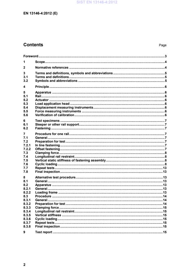 Ta evropski standard določa laboratorijski preskusni postopek za uporabo ponavljajočih se ciklov premika, ki predstavljajo premike zgornjega ustroja železnice, ki jih povzroča promet. Uporablja se za oceno dolgoročnega delovanja neposrednih pritrdilnih sistemov. Postopek se uporablja za tirnice, nameščene na prage, nosilno ogrodje in tire, ter vgrajene tirnice. Ta preskusni postopek se uporablja za celoten pritrdilni sestav.