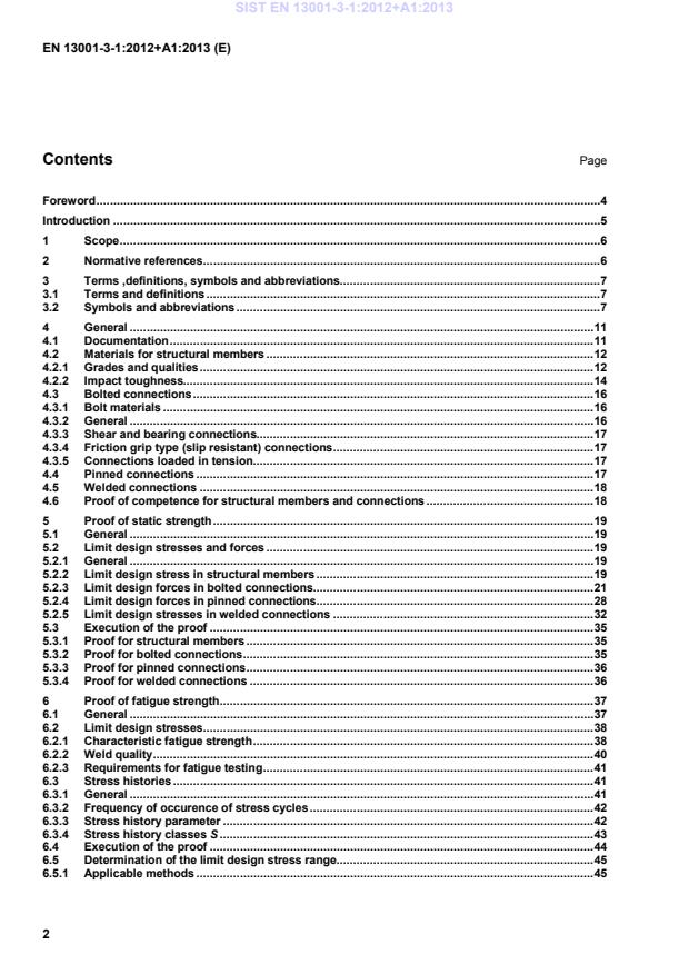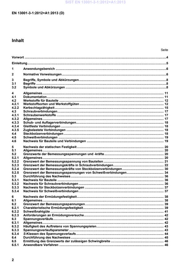 Seite Vorwort .4 Einleitung .5 1 Anwendungsbereich .6 2 Normative Verweisungen .6 3 Begriffe, Symbole und Abkürzungen.8 3.1 Begriffe .8 3.2 Symbole und Abkürzungen .8 4 Allgemeines . 11 4.1 Dokumentation . 11 4.2 Werkstoffe für Bauteile . 12 4.2.1 Werkstoffsorten und Werkstoffgüten . 12 4.2.2 Kerbschlagzähigkeit . 15 4.3 Schraubverbindungen . 17 4.3.1 Schraubenwerkstoffe . 17 4.3.2 Allgemeines . 17 4.3.3 Schub- und Auflagerverbindungen. 18 4.3.4 Gleitfeste Verbindungen . 18 4.3.5 Zugbelastete Verbindungen . 18 4.4 Steckbolzenverbindungen . 18 4.5 Schweißverbindungen . 19 4.6 Nachweis für Bauteile und Verbindungen . 19 5 Nachweis der statischen Festigkeit . 20 5.1 Allgemeines . 20 5.2 Grenzwerte der Bemessungsspannungen und -kräfte . 20 5.2.1 Allgemeines . 20 5.2.2 Grenzwert der Bemessungsspannung von Bauteilen . 21 5.2.3 Grenzwert der Bemessungskräfte in Schraubverbindungen . 22 5.2.4 Grenzwert der Bemessungskräfte von Steckbolzenverbindungen . 30 5.2.5 Grenzwert der Bemessungsspannungen von Schweißverbindungen . 34 5.3 Durchführung des Nachweises . 36 5.3.1 Nachweis für Bauteile . 36 5.3.2 Nachweis für Schraubverbindungen . 36 5.3.3 Nachweis für Steckbolzenverbindungen . 37 5.3.4 Nachweis für Schweißverbindungen . 37 6 Nachweis der Ermüdungsfestigkeit . 38 6.1 Allgemeines . 38 6.2 Grenzwert der Bemessungsspannungen . 39 6.2.1 Charakteristische Ermüdungsfestigkeit . 39 6.2.2 Schweißnahtgüte . 41 6.2.3 Anforderungen an Ermüdungsversuche . 42 6.3 Spannungsverläufe. 42 6.3.1 Allgemeines . 42 6.3.2 Häufigkeit des Auftretens von Spannungspielen . 43 6.3.3 Spannungsverlaufsparameter . 43 6.3.4 S-Klassen des Spannungsverlaufs . 44 6.4 Durchführung des Nachweises . 45 6.5 Ermittlung des Grenzwerts der zulässigen Schwingbreite . 46 6.5.1 Anwendbare Verfahren . 46 SIST EN 13001-3-1:2012+A1:2013