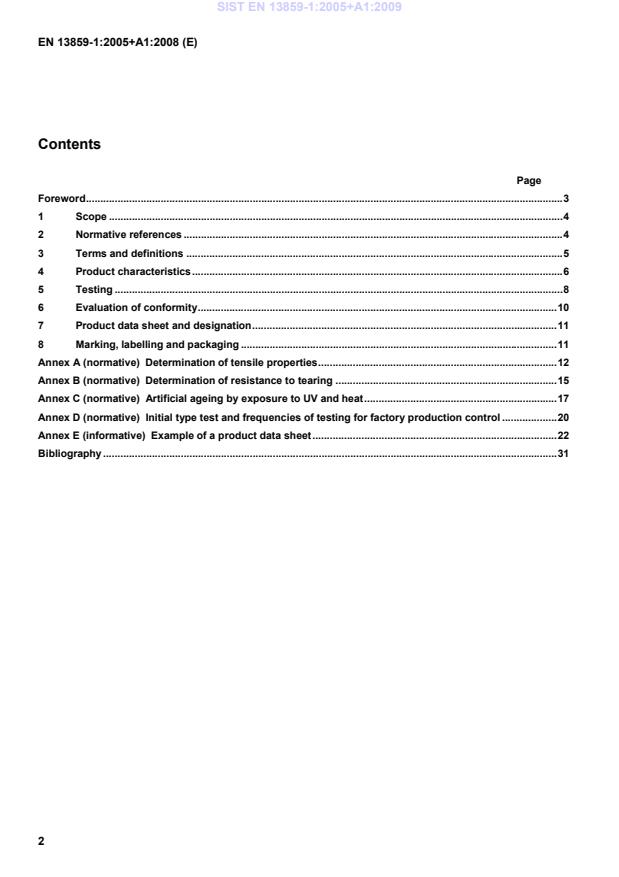 2 Normative references The following referenced documents are indispensable for the application of this document. For dated references, only the edition cited applies. For undated references, the latest edition of the referenced document (including any amendments) applies. EN 1107-1, Flexible sheets for waterproofing — Part 1: Bitumen sheets for roof waterproofing - Determination of dimensional stability EN 1107-2, Flexible sheets for waterproofing — Determination of dimensional stability — Part 2: Plastic and rubber sheets for roof waterproofing EN 1109, Flexible sheets for waterproofing — Bitumen sheets for roof waterproofing — Determination of flexibility at low temperature EN 1296, Flexible sheets for waterproofing— Bitumen, plastic and rubber sheets for roofing— Method of artificial ageing by long term exposure to elevated temperature EN 1297, Flexible sheets for waterproofing — Bitumen, plastic and rubber sheets for roof waterproofing — Method of artificial ageing by long term exposure to the combination of UV radiation, elevated temperature and water EN 1848-1, Flexible sheets for waterproofing — Determination of length, width and straightness — Part 1: Bitumen sheets for roof waterproofing EN 1848-2, Flexible sheets for waterproofing — Determination of length, width, straightness and flatness — Part 2: Plastic and rubber sheets for roof waterproofing EN 1849-1, Flexible sheets for waterproofing — Determination of thickness and mass per unit area — Part 1: Bitumen sheets for roof waterproofing EN 1849-2, Flexible sheets for waterproofing — Determination of thickness and mass per unit area — Part 2: Plastic and rubber sheets for roof waterproofing !EN 1928:2000", Flexible sheets for waterproofing — Bitumen, plastic and rubber sheets for roof waterproofing — Determination of watertightness EN 1931, Flexible sheets for waterproofing — Bitumen, plastic and rubber sheets for roof waterproofing — Determination of water vapour transmission properties EN 12310-1:1999, Flexible sheets for waterproofing — Part 1: Bitumen sheets for waterproofing — Determination of resistance to tearing (nail shank) EN 12311-1, Flexible sheets for waterproofing — Part 1: Bitumen sheets for roof waterproofing — Determination of tensile properties EN 13111, Flexible sheets for waterproofing — Underlays for discontinuous roofing and walls — Determination of resistance to water penetration SIST EN 13859-1:2005+A1:2009