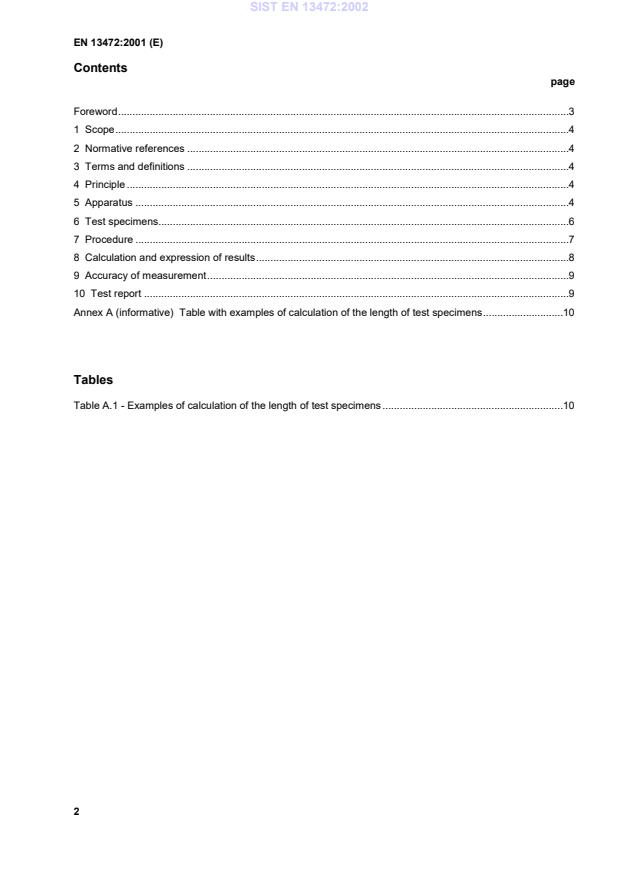 Table with examples of calculation of the length of test specimens.10TablesTable A.1 - Examples of calculation of the length of test specimens.10SIST EN 13472:2002