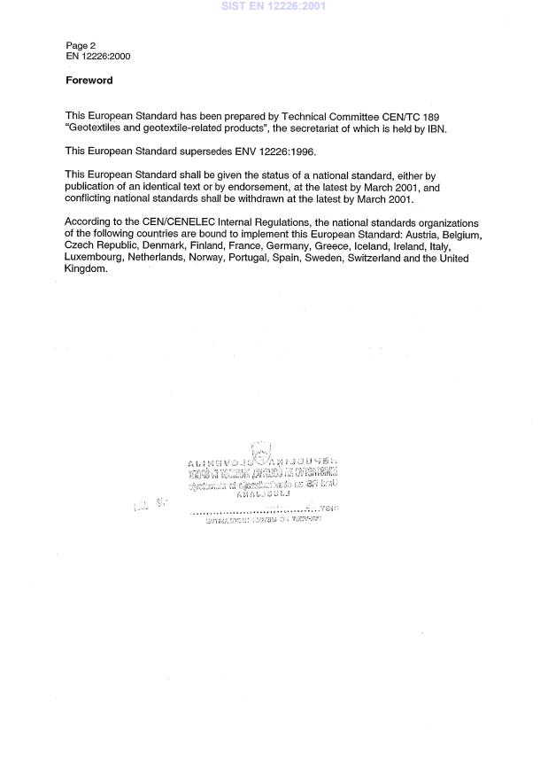 EN 12226:2000 is a standard published by the European Committee for Standardization (CEN). Its full title is "Geotextiles and geotextile-related products - General tests for evaluation following durability testing". This standard covers: This standard specifies test methods for determining the change in specific properties of aged textiles. It is applicable to geotextiles and geotextile-related products. Further reference should be made to CR ISO 12434.