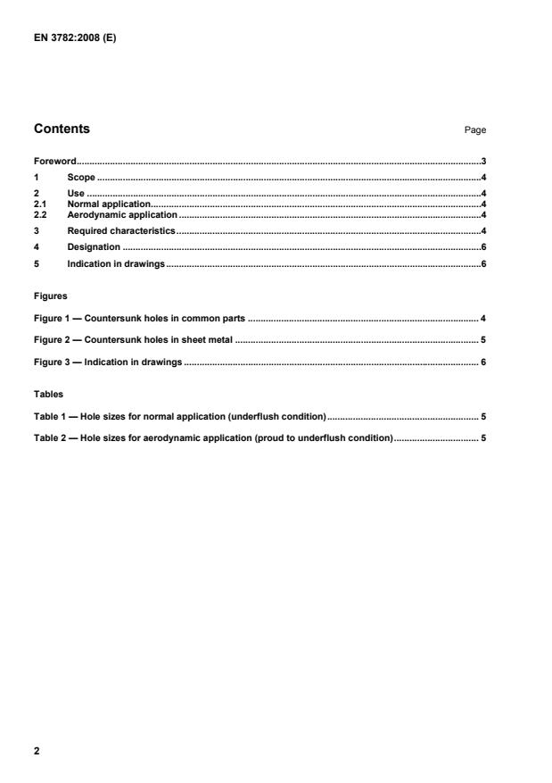 EN 3782:2008 is a standard published by the European Committee for Standardization (CEN). Its full title is "Aerospace series - Holes for 100° countersunk head screws - Design standard". This standard covers: This standard specifies holes in common parts and sheet metal for 100° countersunk head screws with nominal diameters of 3 mm to 5 mm and head configuration according to EN standards for aerospace applications.
