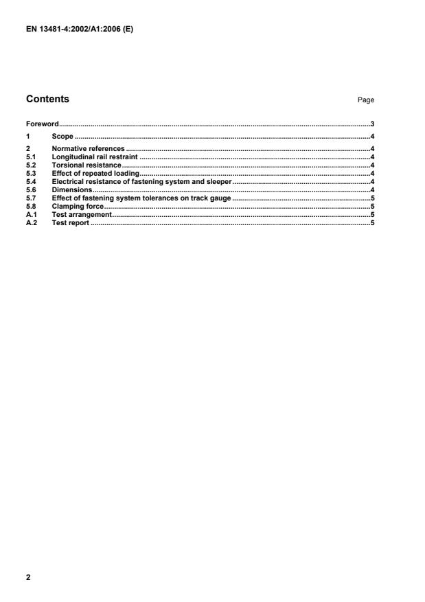 EN 13481-4:2002/A1:2006 is a amendment published by the European Committee for Standardization (CEN). Its full title is "Railway applications - Track - Performance requirements for fastening systems - Part 4: Fastening systems for steel sleepers". This standard covers: This European Standard is applicable to fastening systems for use on steel sleepers in ballasted track as follows: ¾ main lines having a radius of curvature greater than 150 m and subject to a maximum design axle load of 260 kN; ¾ light rail systems having a radius of curvature greater than 80 m and subject to a maximum design axle load of 130 kN. The requirements apply to: ¾ direct fastening systems and systems which incorporate a baseplate; ¾ fastening systems for the rail sections in prEN 13674-1 and prEN 13674-4. This standard is not applicable to fastening systems for other rail sections, rigid fastening systems or special fastening systems used at bolted joints. This standard is for type approval of a complete fastening assembly only.