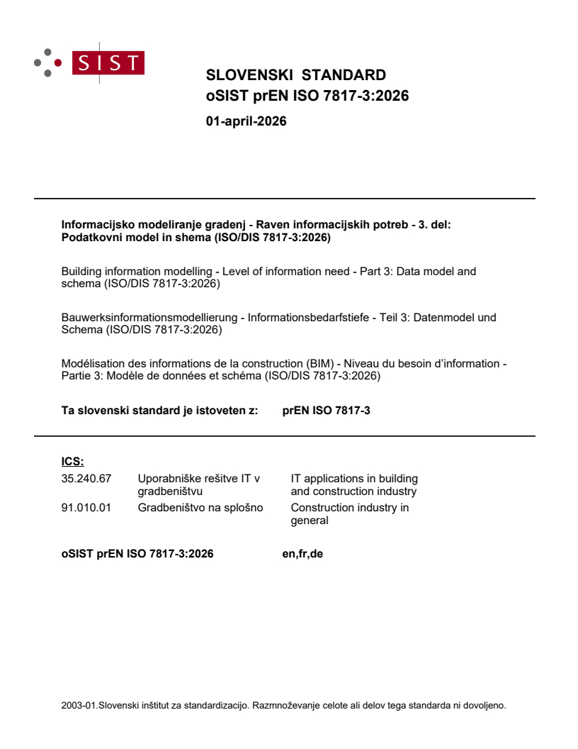 Informacijsko modeliranje gradenj - Raven informacijskih potreb - 3. del: Podatkovni model in shema (ISO/DIS 7817-3:2026)