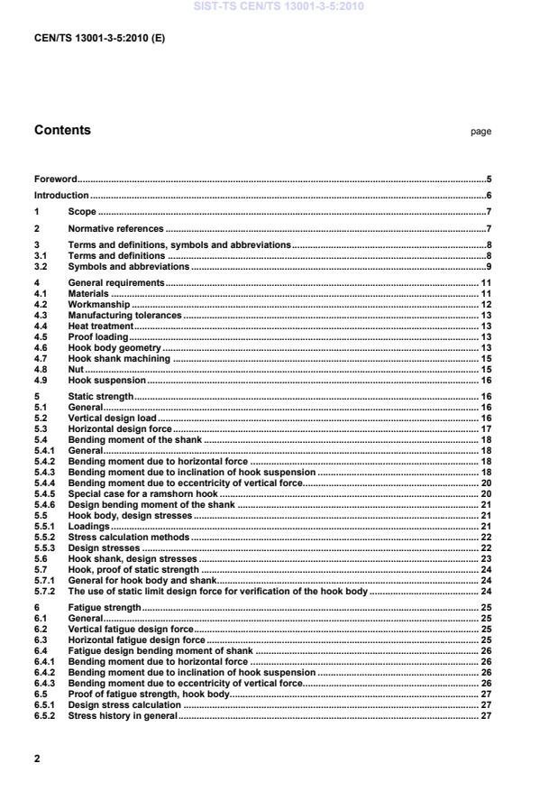 CEN/TS 13001-3-5:2010 is a technical specification published by the European Committee for Standardization (CEN). Its full title is "Cranes - General design - Part 3-5: Limit states and proof of competence of forged hooks". This standard covers: This Technical Specification should be used together with the other relevant parts of the standard series. As such, they specify general conditions, requirements and methods to prevent hazards in hooks as part of all types of cranes. This Technical Specification covers the following parts of hooks and types of hooks: - bodies of any type of point hooks made of steel forgings; - machined shanks of hooks with a thread/nut suspension. NOTE 1 Principles of this Technical Specification can be applied to other types of shank hooks and also where stress concentration factors relevant to that shank construction are determined and used. Plate hooks, which are those, assembled of one or several parallel parts of rolled steel plates are not covered in this Technical Specification. This Technical Specification is applicable to hooks from materials with ultimate strength of no more than 800 N/mm2 and yield stress of no more than 600 N/mm2. The following is a list of significant hazardous situations and hazardous events that could result in risks to persons during normal use and foreseeable misuse. Clauses 4 to 8 of this document are necessary to reduce or eliminate the risks associated with the following hazards: a) Exceeding the limits of strength (yield, ultimate, fatigue); b) Exceeding temperature limits of material; c) Unintentional disengagement of the load from the hook. The requirements of this Technical Specification are stated in the main body of the document and are applicable to hook designs in general. The hook body and shank designs listed in Annexes A, B and G are only examples and should not be referred to as requirements of this Technical Specification. This Technical Specification is applicable to cranes, which are manufactured after the date of approval of this standard by CEN, and serves as a reference base for product standards of particular crane types. NOTE 2 This CEN/TS 13001-3-5 deals only with the limit state method in accordance with EN 1300