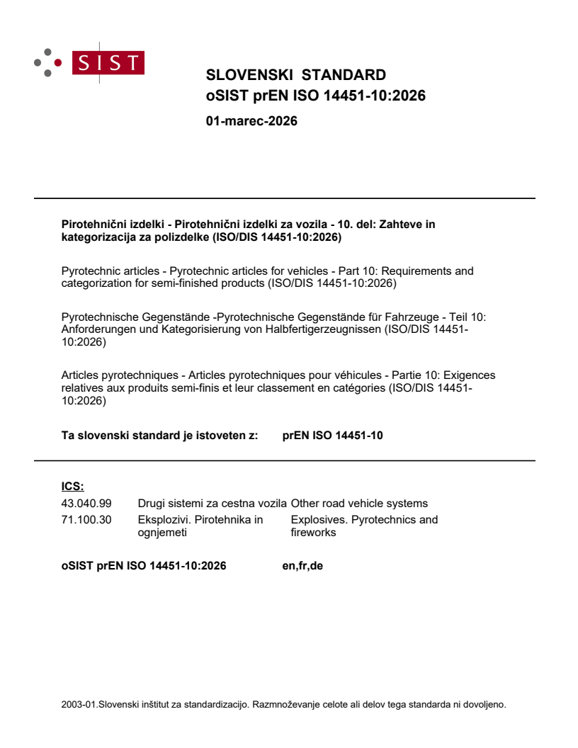Pirotehnični izdelki - Pirotehnični izdelki za vozila - 10. del: Zahteve in kategorizacija za polizdelke (ISO/DIS 14451-10:2026)