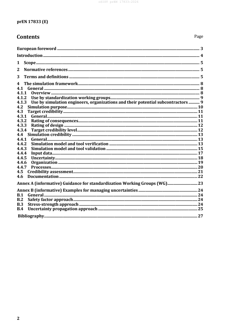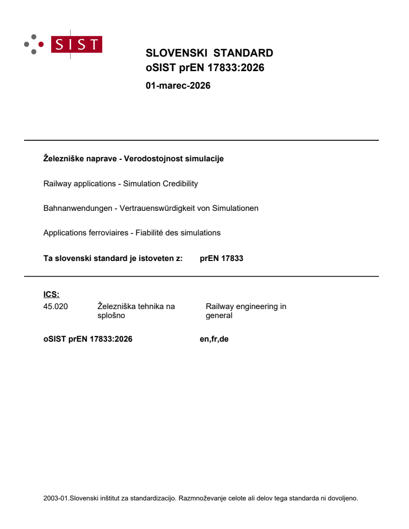 prEN 17833 is a draft published by the European Committee for Standardization (CEN). Its full title is "Railway applications - Simulation Credibility". This standard covers: This document sets out a framework to replace and/or complement physical tests with virtual tests by introducing simulation credibility for a given railway application. This covers simulation development, use, and management. Users of this document can be: - simulation engineers or organizations and their subcontractors, - standardization working groups to introduce simulations in their standards or - technical assessors and conformity assessment bodies. This document provides guidance, particularly when simulations are not yet defined. Where applicable, this document can be used in conjunction with existing standards pertaining to the use of simulations. If simulation is already recognized in existing domain-specific standards, this document does not modify the requirements of those standards. However, it may assist in future improvements and harmonization. It does not provide domain-specific guidance on applying simulations. For the use of technologies including, but not limited to, artificial intelligence, model-scale testing, and distributed computing, relevant potential technology based risks can arise.