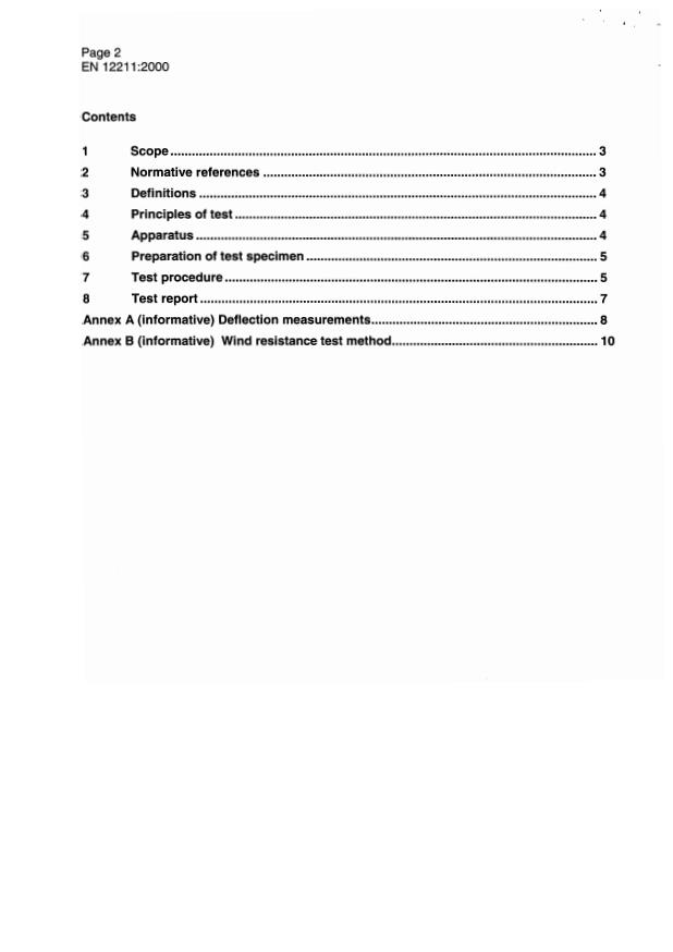 EN 12211:2000 is a standard published by the European Committee for Standardization (CEN). Its full title is "Windows and doors - Resistance to wind load - Test method". This standard covers: This standard defines the method of test to determine the resistance to wind load for completely assembled windows and doors of any materials when submitted to positive and negative test pressures. This test method is designed to take account of conditions in use, when the window or door is installed in accordance with the manufactures specification and the requirements of relevant European Standard and codes of pratice. This Standard does not apply to joints between the window or door frame and the building construction. This Standard is not intended to evaluate strength of the glass.