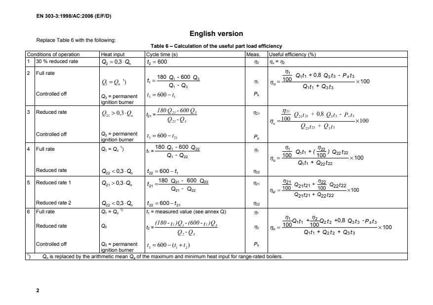 EN 303-3:1998/AC:2006 is a corrigendum published by the European Committee for Standardization (CEN). Its full title is "Heating boilers - Part 3: Gas-fired central heating boilers - Assembly comprising a boiler body and a forced draught burner". This standard covers: TC - Replace Tables 5 and 6