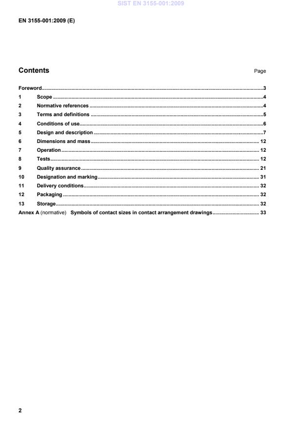 6 Dimensions and mass The dimensions of the contacts and their mass are defined in the product standard. 7 Operation The tools for connecting and installing the contacts are defined in the product standard. 8 Tests See Table 2. All the tests are carried out without elements of connection, with the exception of tests EN 2591-402, EN 2591-403, EN 2591-406 and EN 2591-415. SIST EN 3155-001:2009