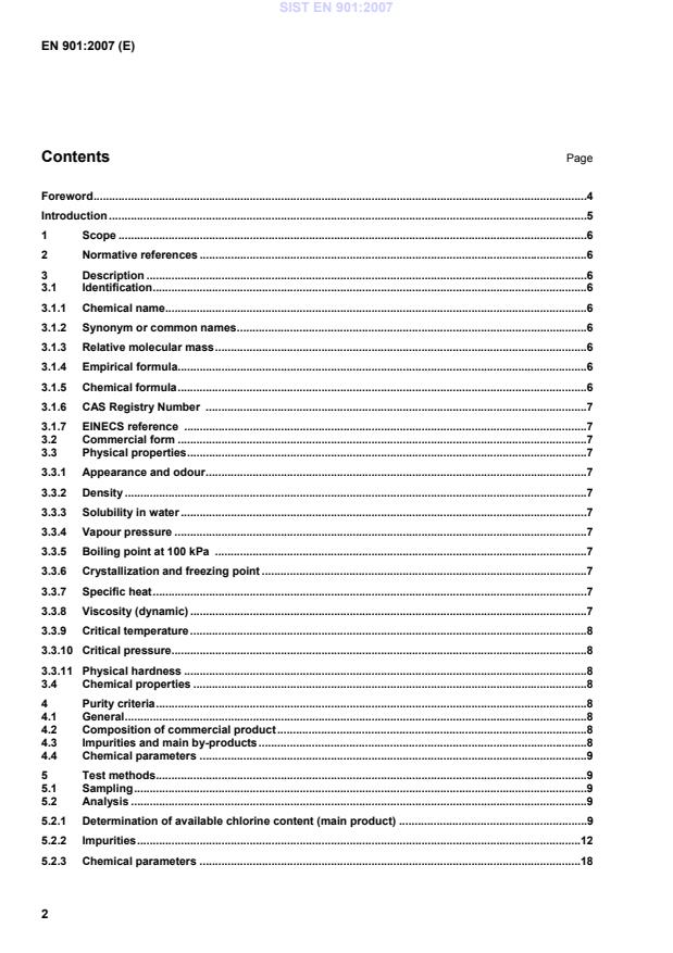 EN 901:2007 is a standard published by the European Committee for Standardization (CEN). Its full title is "Chemicals used for treatment of water intended for human consumption - Sodium hypochlorite". This standard covers: This European Standard is applicable to sodium hypochlorite used for treatment of water intended for human consumption. It describes the characteristics of sodium hypochlorite and specifies the requirements and the corresponding test methods for sodium hypochlorite. It gives information on its use in water treatment. It also determines the rules relating to safe handling and use of sodium hypochlorite (see Annex B). NOTE While this standard is not applicable to sodium hypochlorite generated in-situ (see bibliographic reference [6]) the limits for impurities and chemical parameters apply.