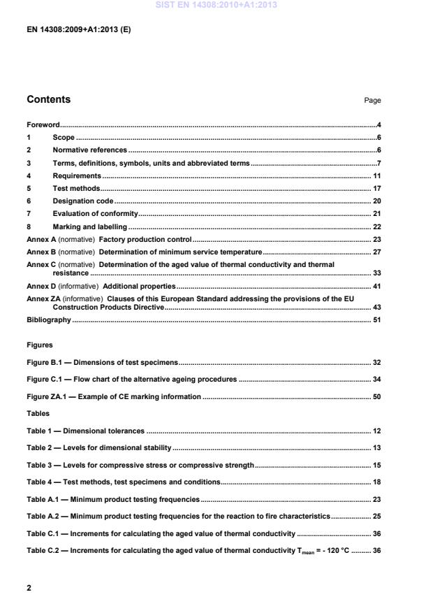 Figures Figure B.1 — Dimensions of test specimens . 32 Figure C.1 — Flow chart of the alternative ageing procedures . 34 Figure ZA.1 — Example of CE marking information . 50 Tables Table 1 — Dimensional tolerances . 12 Table 2 — Levels for dimensional stability . 13 Table 3 — Levels for compressive stress or compressive strength . 15 Table 4 — Test methods, test specimens and conditions. 18 Table A.1 — Minimum product testing frequencies . 23 Table A.2 — Minimum product testing frequencies for the reaction to fire characteristics . 25 Table C.1 — Increments for calculating the aged value of thermal conductivity . 36 Table C.2 — Increments for calculating the aged value of thermal conductivity Tmean = - 120 °C . 36 SIST EN 14308:2010+A1:2013