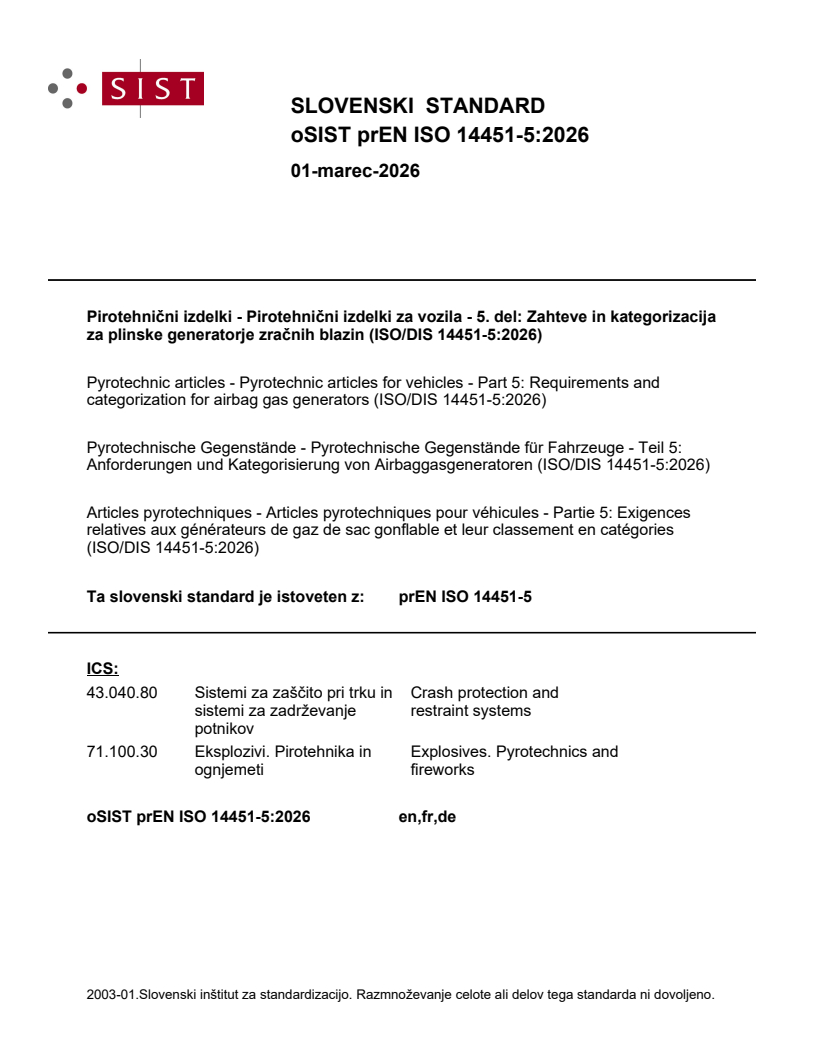 Pirotehnični izdelki - Pirotehnični izdelki za vozila - 5. del: Zahteve in kategorizacija za plinske generatorje zračnih blazin (ISO/DIS 14451-5:2026)