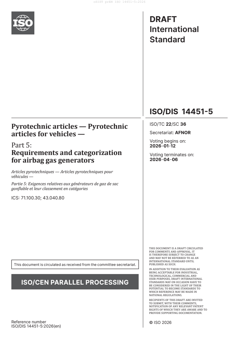 prEN ISO 14451-5 is a draft published by the European Committee for Standardization (CEN). Its full title is "Pyrotechnic articles - Pyrotechnic articles for vehicles - Part 5: Requirements and categorization for airbag gas generators (ISO/DIS 14451-5:2026)". This standard covers: ISO 14451-5:2013 specifies the types and order of tests for application to the airbag gas generators and sets out the acceptance criteria and means of categorization. ISO 14451-5:2013 applies to type tests. ISO 14451-5:2013 is not applicable to articles containing military explosives or commercial blasting agents except for black powder or flash composition.