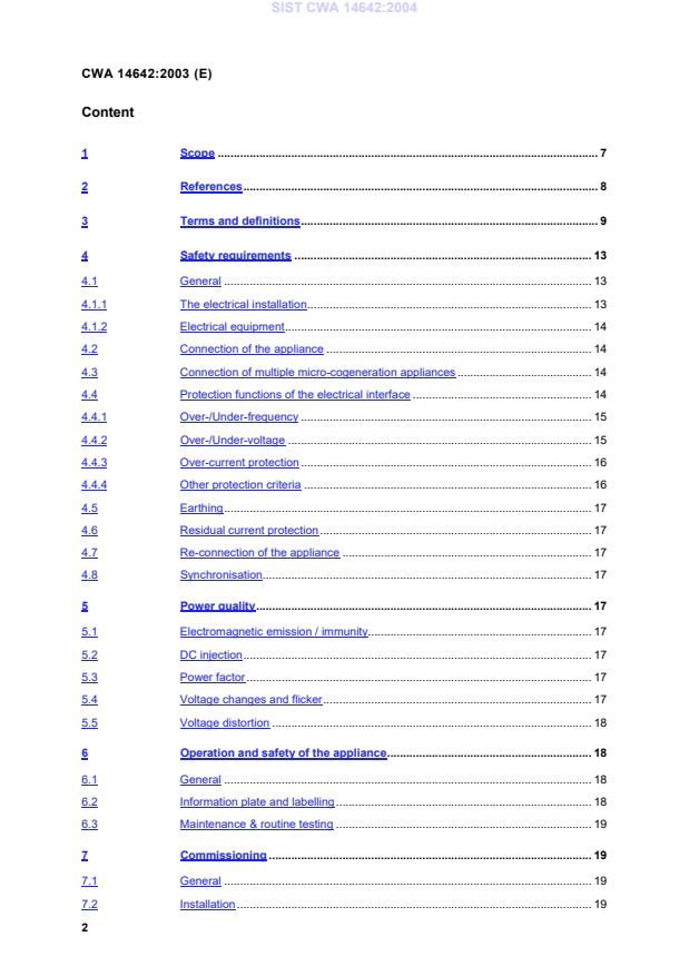 CWA 14642:2003 is a standardization document published by the European Committee for Standardization (CEN). Its full title is "CEN Workshop Agreement (CWA) - Electrical interface for domestic cogeneration - Requirements for distribution network connection for micro cogeneration systems for domestic use up to 16 A per phase in low-voltage distribution networks (230/400 V)". This standard covers: Micro-cogeneration is the generation of electricity and the recovery and use of the thermal energy supplying the needs of domestic premises. This CEN Workshop Agreement covers the electrical interface between the appliance and the low-voltage electrical network (nominal 230/400 V). Specific elements like metering are not included. The intention of the CWA is to recommend future good practice, noting that the CWA, local existing standards and practices may require modification in the future due to larger market penetration and the associated return of experience. NOTE The CWA reflects a pan-European view on best practice for the connection of micro-cogeneration; however it may not be the most appropriate document for use in all countries and under all circumstances. The following aspects are included in the scope: · all technologies for micro-cogeneration are applicable; · all generator types are applicable; · the size is limited to a maximum of 16A per phase in a single low-voltage installation (nominal 230/400V) · both 3-phase and single-phase connections are applicable; · connection is limited to low voltage networks; · the electrical interface is the principal focus and this includes the method of connection, the settings and protection requirements for connection, the operation of the electrical interface under normal conditions, emergency shutdown, distribution network-independent operation, start-up and distribution network synchronisation; · this document relates to the electrical interface only as existing standards and directives apply to the other parts of the system; · this document covers technical issues of connection. NOTE The size is maybe increased up to 20 A (24 A) in accordance to the existing national standards in Germany, Austria,