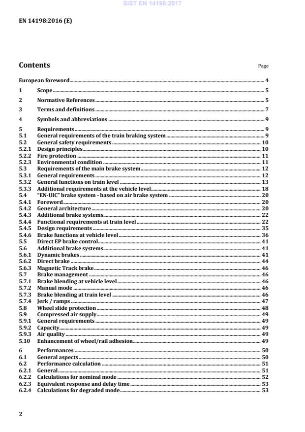 braked weight percentage AC Alternating Current BP Brake Pipe CCS Control Command and Signalling system CSM Common Safety Methods CW Marking for freight wagons depending on compliance with TSI WAG requirements, for application refer to Commission Regulation (EU) No 321/2013, Annex C, Clause 5 “Marking of units” DC Direct Current (“Berlin DC-Network” means network of the S-Bahn Berlin, Germany, which runs on DC) EMC Electromagnetic Compatibility ETCS European Train Control System GE Marking for freight wagons depending on compliance with TSI WAG requirements, for application refer to Commission Regulation (EU) No 321/2013, Annex C, Clause 5 “Marking of units” MRP Main Reservoir Pipe MTB Magnetic Track Brake RER Le Réseau Express Regional (Network of Express Train Lines in and around Paris, France) UIC International Union of Railways (Union internationale des chemins de fer) UK United Kingdom WSP Wheel Slide Protection system 5 Requirements 5.1 General requirements of the train braking system The purpose of the train braking system is to ensure that the train’s speed can be reduced or maintained on a slope, or that the train can be stopped within the maximum allowable braking distance. Braking also provides the immobilization of a train either for a certain period of time or permanently when it is not in operation or without any energy on board. Units designed and assessed to be operated in general operation (various formations of vehicles from different origins; train formation not defined at the design stage) shall be fitted with a technically compatible brake system to ensure the brake function in all vehicles of the train. SIST EN 14198:2017
