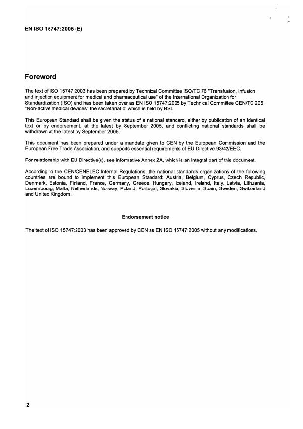EN ISO 15747:2005 is associated with the following European legislation: EU Directives/Regulations: 93/42/EEC; Standardization Mandates: M/295. When a standard is cited in the Official Journal of the European Union, products manufactured in conformity with it benefit from a presumption of conformity with the essential requirements of the corresponding EU directive or regulation.