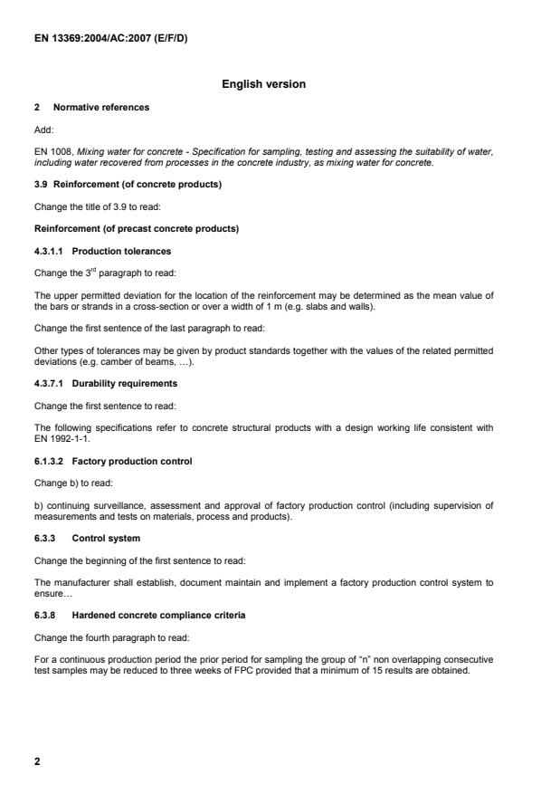EN 1008, Mixing water for concrete - Specification for sampling, testing and assessing the suitability of water, including water recovered from processes in the concrete industry, as mixing water for concrete. 3.9 Reinforcement (of concrete products) Change the title of 3.9 to read: Reinforcement (of precast concrete products) 4.3.1.1 Production tolerances Change the 3rd paragraph to read: The upper permitted deviation for the location of the reinforcement may be determined as the mean value of the bars or strands in a cross-section or over a width of 1 m (e.g. slabs and walls). Change the first sentence of the last paragraph to read: Other types of tolerances may be given by product standards together with the values of the related permitted deviations (e.g. camber of beams, …). 4.3.7.1 Durability requirements Change the first sentence to read: The following specifications refer to concrete structural products with a design working life consistent with EN 1992-1-1. 6.1.3.2 Factory production control Change b) to read: b) continuing surveillance, assessment and approval of factory production control (including supervision of measurements and tests on materials, process and products). 6.3.3 Control system Change the beginning of the first sentence to read: The manufacturer shall establish, document maintain and implement a factory production control system to ensure… 6.3.8 Hardened concrete compliance criteria Change the fourth paragraph to read: For a continuous production period the prior period for sampling the group of “n” non overlapping consecutive test samples may be reduced to three weeks of FPC provided that a minimum of 15 results are obtained.