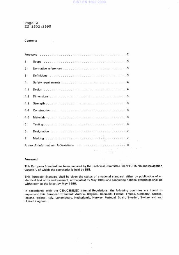 EN 1502:1995 is a standard published by the European Committee for Standardization (CEN). Its full title is "Inland navigation vessels - Boarding ladders". This standard covers: This standard specifies the type, dimensions, strength requirements and test conditions which shall be complied with for reasons of safety. Boarding ladders are used on inland navigation vessels for climbing into ship's boats, disembarking or crossing over onto vessels with lower decks. They are not intended for use by passengers. Boarding ladders are generally required for vessels having a boarding height greater than 1,5 m above the light water-line. They may be used up to a height of around 3,0 m above the light water-line.