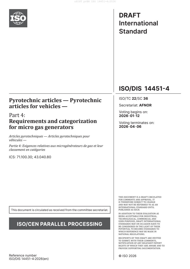 prEN ISO 14451-4 is a draft published by the European Committee for Standardization (CEN). Its full title is "Pyrotechnic articles - Pyrotechnic articles for vehicles - Part 4: Requirements and categorization for micro gas generators (ISO/DIS 14451-4:2026)". This standard covers: ISO 14451-4:2013 specifies the types and order of tests to be applied to micro gas generators and sets out the associated acceptance criteria and means of categorization. ISO 14451-4:2013 applies to type tests. ISO 14451-4:2013 is not applicable to articles containing military explosives or commercial blasting agents except for black powder or flash composition.
