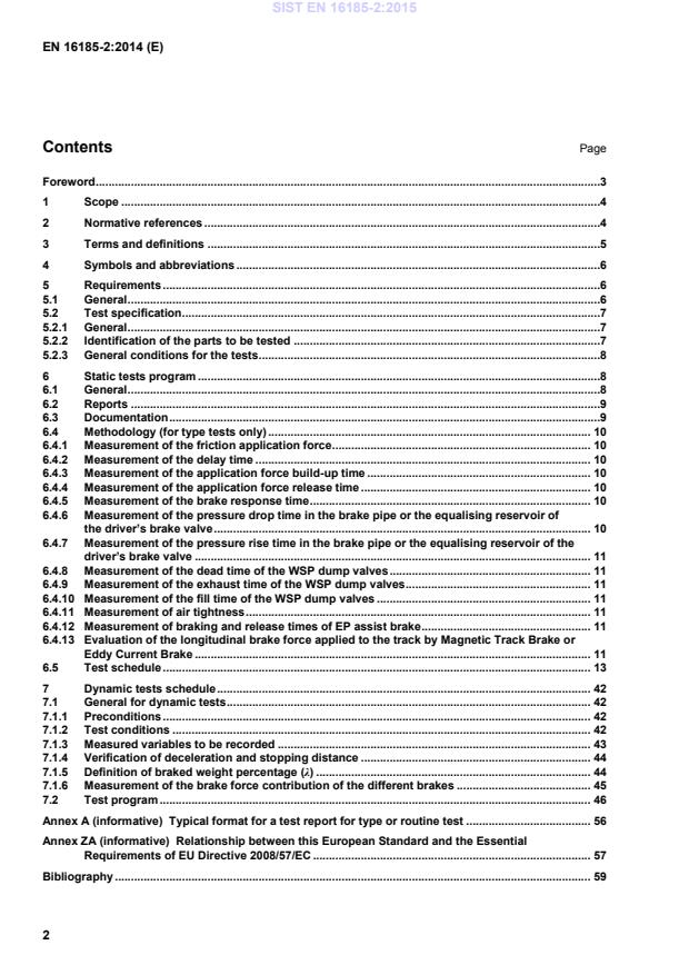 EN 16185-2:2014 is a standard published by the European Committee for Standardization (CEN). Its full title is "Railway applications - Braking systems of multiple unit trains - Part 2: Test methods". This standard covers: This European Standard specifies test methods and acceptance criteria for a brake system for use in self propelling thermal and electric trains, in the following document called EMU/DMU, operating on routes of the European conventional rail system network. This European Standard is applicable to: - all new vehicles designs of self-propelling thermal and electric trains; - all major overhauls of the EMU/DMU if they involve redesigning or extensive alteration to the brake system of the vehicle concerned. This European Standard does not cover: - locomotive hauled trains which are specified by EN 14198; - mass transit rolling stock which is specified by EN 13452 (all parts); - high speed trains being operated at speeds greater than 200 km/h which are specified by EN 15734-1 and tests in EN 15734-2. The functional testing requirements set out in this European Standard assume the vehicles are fitted with brake system architecture as defined in prEN 16185 1. The braking performance obtained by applying the tests defined in this European Standard can be used to assess compliance with the required braking performance as defined in prEN 16185-1.