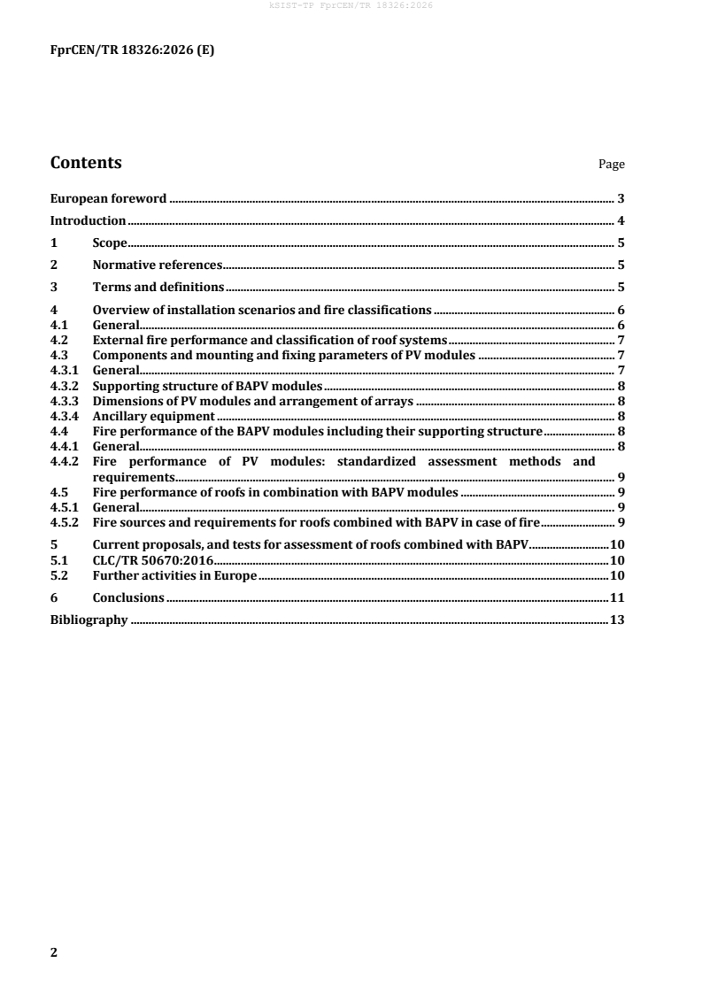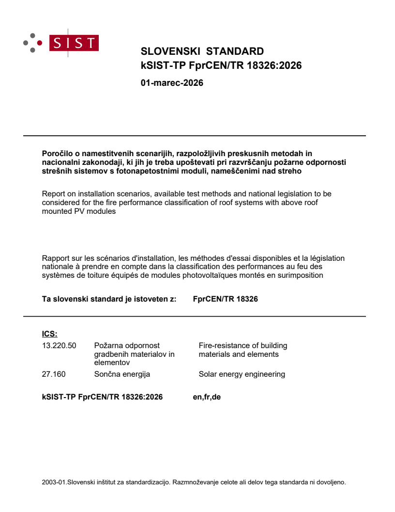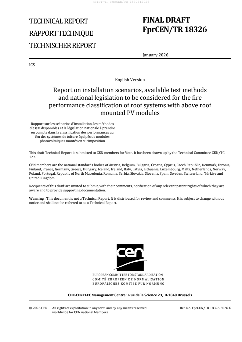 FprCEN/TR 18326 is a draft published by the European Committee for Standardization (CEN). Its full title is "Report on installation scenarios, available test methods and national legislation to be considered for the fire performance classification of roof systems with above roof mounted PV modules". This standard covers: This document reviews installation scenarios, available test methods and national legislations to be considered when determining the external fire performance of roofs with above roof PV systems. The report also reviews the current partners and approvals in the planning, installation and operation/maintenance of above roof PV installations, together with their current responsibilities.