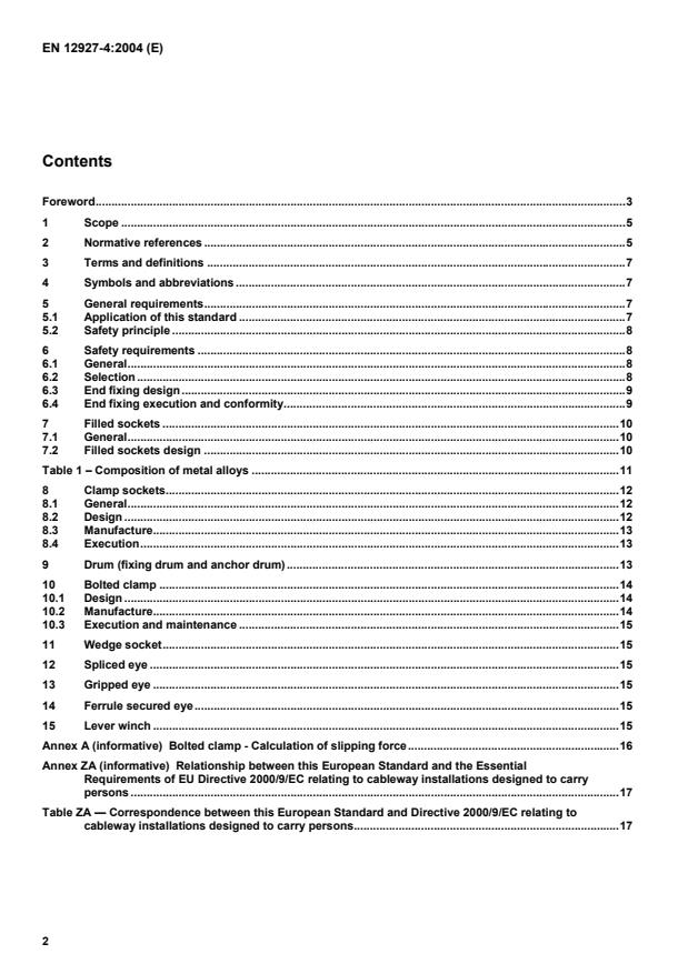 EN 12927-4:2004 is a standard published by the European Committee for Standardization (CEN). Its full title is "Safety requirements for cableway installations designed to carry persons - Ropes - Part 4: End fixings". This standard covers: This part of EN 12927 specifies the safety requirements applicable to end fixings of steel wire ropes for installations for passenger transportation by rope. This standard is applicable to the various types of installations and takes into account their environment. This part of EN 12927 applies to the following types of end fixing when used in installations for passenger transportation by ropes in conformity with EN 12927-1. - filled socket; - clamp socket; - drum; - bolted clamp; - wedge socket; - spliced eye; - gripped eye; - ferrule secured eye; - lever winch. Taking its scope into account, it does not include requirements relating to the prevention of accidents and the protection for workers. It does not apply to installations for the transportation of goods, nor to inclined lifts.