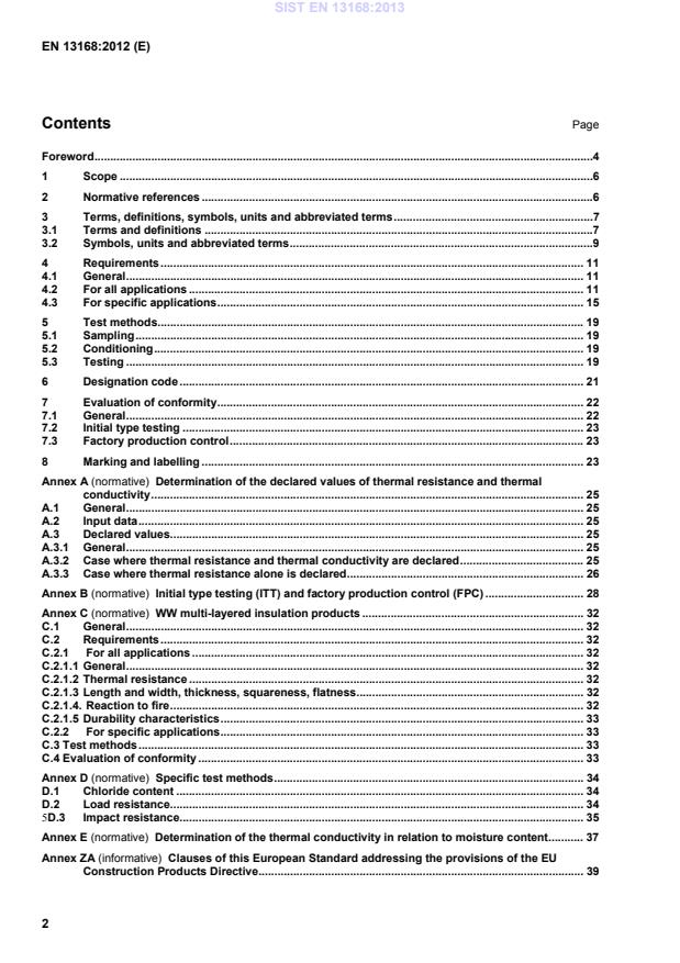 WW multi-layered insulation products . 32C.1General . 32C.2Requirements . 32C.2.1 For all applications . 32C.2.1.1 General . 32C.2.1.2Thermal resistance . 32C.2.1.3Length and width, thickness, squareness, flatness . 32C.2.1.4. Reaction to fire . 32C.2.1.5Durability characteristics . 33C.2.2 For specific applications . 33C.3 Test methods . 33C.4 Evaluation of conformity . 33Annex D (normative)