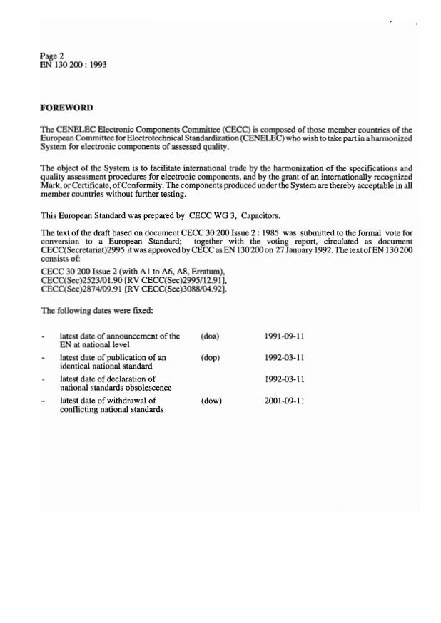 EN 130200:1993 is a standard published by CLC. Its full title is "Sectional Specification: Fixed tantalum capacitors with non-solid or solid electrolyte". This standard covers: Supersedes CECC 30 200:1985 & its amdts