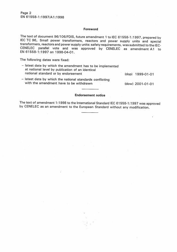 EN 61558-1:1997/A1:1998 is a amendment published by CLC. Its full title is "Safety of power transformers, power supply units and similar - Part 1: General requirements and tests". This standard covers: EN following parallel vote * Issued by BTTF 64-1 superseded by TC 96 disbanded by 114 BT * Superseded by EN 61558-1:2005
