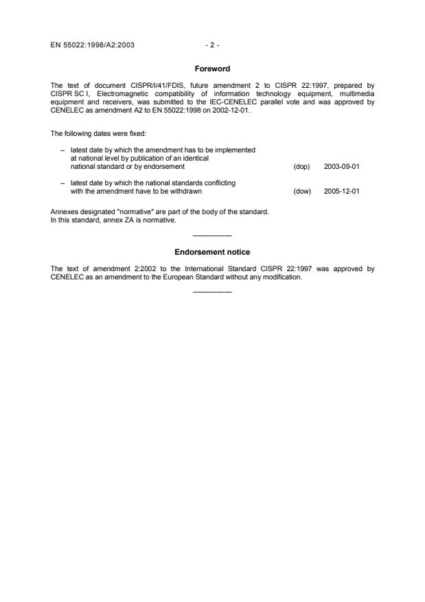This amendment A2 modifies the European Standard EN 55022:1998; it was approved by CENELEC on