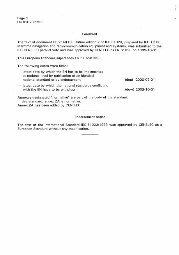 EN 61023:1999 is a standard published by CLC. Its full title is "Maritime navigation and radiocommunication equipment and systems - Marine speed and distance measuring equipment (SDME) - Performance requirements - Methods of testing and required test results". This standard covers: Specifies the minimum performance requirements, methods of testing and required test results of devices intended to indicate speed and distance (SDME), as required by the International Convention for the Safety of Life at Sea (SOLAS). Is associated with EN 60945 and is based upon the requirements of IMO Resolution A.824.