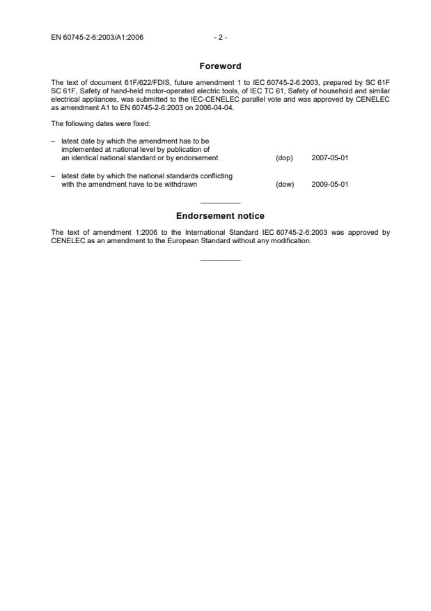 This amendment A1 modifies the European Standard EN 60745-2-6:2003; it was approved by CENELEC on
