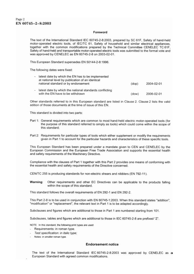 EN 60745-2-8:2003 is a standard published by CLC. Its full title is "Hand-held motor-operated electric tools - Safety - Part 2-8: Particular requirements for shears and nibblers". This standard covers: Deals with the safety of hand-held motor-operated or magnetically driven tools, specific requirements for shears and nibblers. The rated voltage being not more tha 250 V for single-phase a.c. or d.c., and 440 V for three-phase a.c. tools.