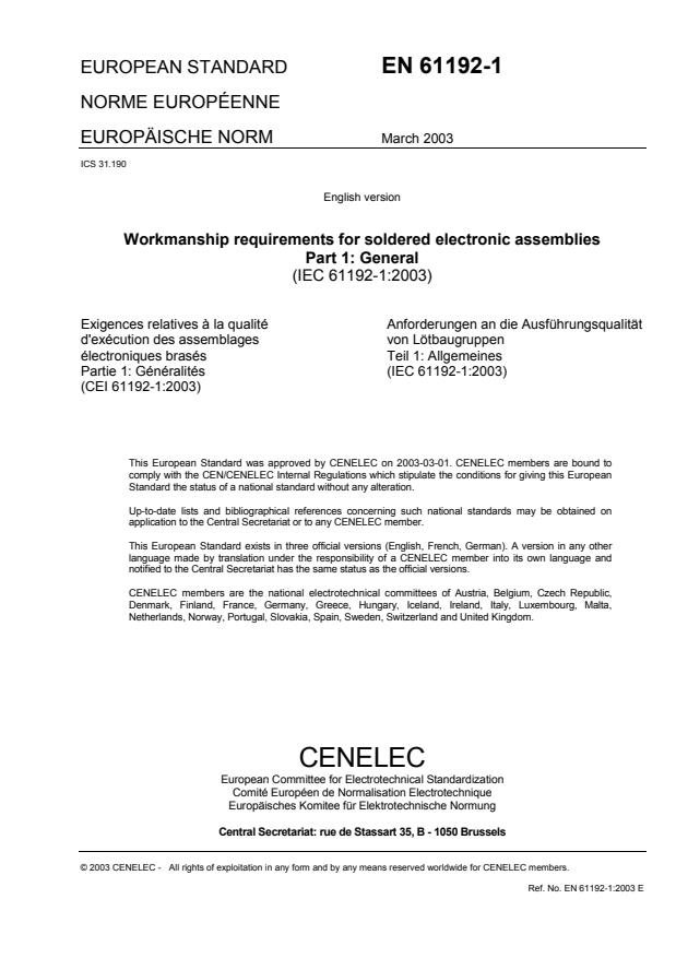EN 61192-1:2003 is a standard published by CLC. Its full title is "Workmanship requirements for soldered electronic assemblies - Part 1: General". This standard covers: Specifies general requirements for workmanship in soldered electronic assemblies on printed boards and on similar laminates attached to the surface(s) of organic substrates. Defines requirements and guidelines for good workmanship and practice in the preparation, soldering, inspection and testing of electronic and electrical assemblies. Enables achievement of high yields and high product quality through process control in production.