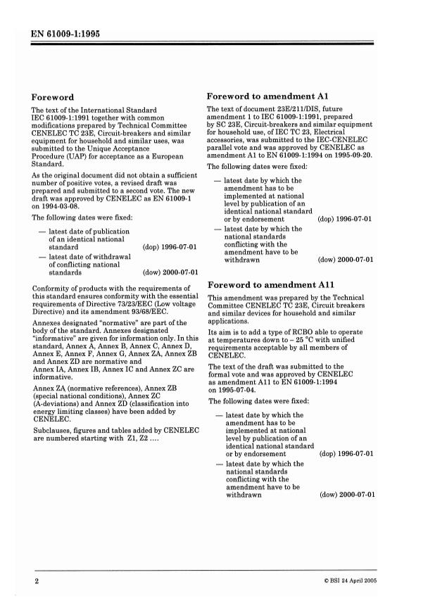 EN 61009-1:1994 is a standard published by CLC. Its full title is "Electrical accessories - Residual current operated circuit-breakers with integral overcurrent protection for household and similar uses (RCBO's) - Part 1: General rules". This standard covers: This Standard applies to residual current operated circuit-breakers with integral overcurrent protection functionally independent of, or functionally dependent on, line voltage for household and similar uses (hereafter referred to as RCBO's) for rated voltages not exceeding 440 V a.c., rated currents not exceeding 125A for fixed installation and rated short-circuit capacities not exceeding 25 000 A for operation at 50 Hz or 60 Hz. These devices are intended to protect people against indirect contact, the exposed conductive parts of the installation being connected to an appropriate earth electrode and to protect against overcurrents the wiring installations of buildings and similar applications. They may be used to provide protection against fire hazards due to a persistent earth fault current, without the operation of the overcurrent protective device. RCBO's having a rated residual operating current not exceeding 30 mA are also used as a means for additional protection in the case of failure of the protective means against electric shock. This standard applies to devices performing simultaneously the function of detection of the residual current, of comparison of the value of this current with the residual operating value and of opening of the protected circuit when the residual current exceeds this value, and also of performing the function of making, carrying and breaking overcurrents under specified conditions. Special precautions (e.g. lightning arresters) may be necessary when excessive overvoltages are likely to occur on the supply side (for example in the case of supply through overhead lines). This standard also applies to RCBO's obtained by the assembly of an adaptable residual current device with a circuit-breaker. The mechanical assembly shall be effected in the factory by the manufacturer, or on site, in which case the requirements of annex G shall apply. It also applies to RCBO's having more than one rated current, provided that the means for changing from one discrete rating to another is not accessible in normal service and that the rating cannot be changed without the use of a tool. Supplementary requirements may be necessary for RCBO's of the plug-in type. Particular requirements are necessary for RCBO's integrated in one unit with a socket-outlet or designed exclusively for being associated locally with a socket-outlet in the same mounting box. This standard does not apply to: RCBO's intended to protect motors, RCBO's the current setting of which is adjustable by means accessible to the user in normal service; RCBO's having more than one rated current. The requirements of this standard apply for normal environmental conditions. Additional requirements may be necessary for RCBO's used in locations having severe environmental conditions. RCBO's including batteries are not covered by this standard.