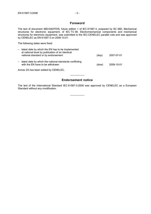 Foreword The text of document 48D/340/FDIS, future edition 1 of IEC 61587-3, prepared by SC 48D, Mechanical structures for electronic equipment, of IEC TC 48, Electromechanical components and mechanical structures for electronic equipment, was submitted to the IEC-CENELEC parallel vote and was approved by CENELEC as EN 61587-3 on 2006-10-01. The following dates were fixed: – latest date by which the EN has to be implemented