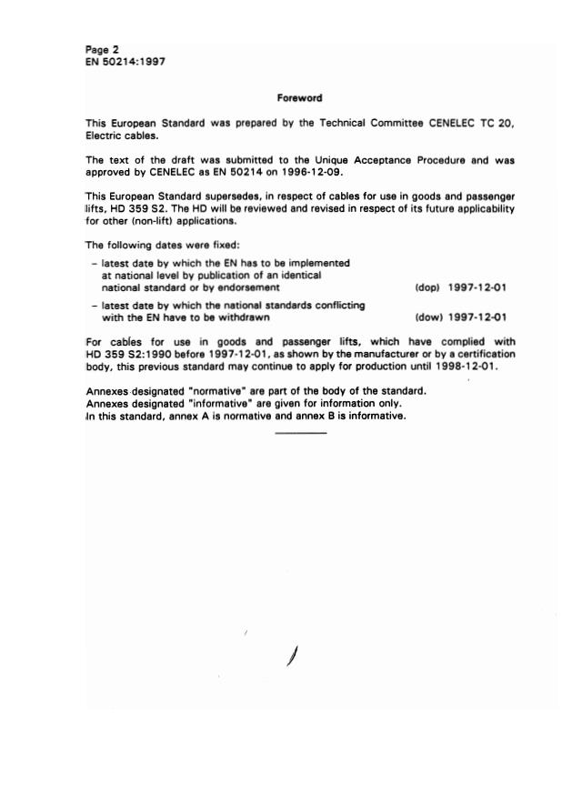 EN 50214:1997 is a standard published by CLC. Its full title is "Flexible cables for lifts". This standard covers: This European Standard covers the construction, requirements and particular test methods for flat, flexible PVC insulated and PVC sheathed cables, of rated voltage U/U 300/500 V, for use in passenger and goods lifts (elevators), as required by EN 81. Cables of composite construction (for instance, cable with cores of different sizes) are not specified, but conditions are given for the inclusion of telecommunication units into the cables