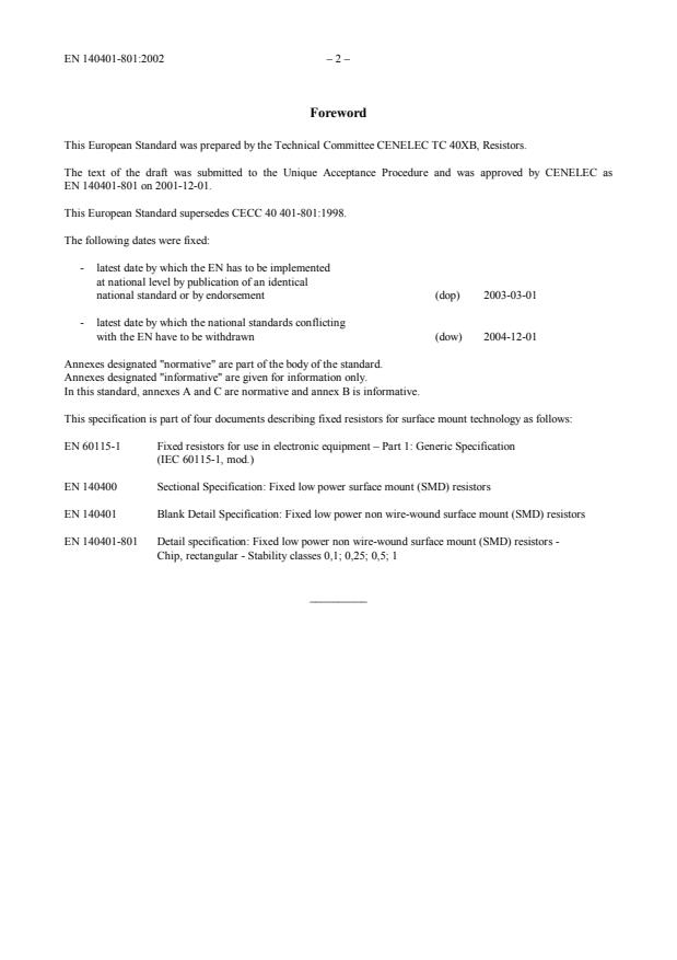 EN 140401-801:2002 is a standard published by CLC. Its full title is "Detail Specification: Fixed low power non wire-wound surface mount (SMD) resistors - Rectangular - Stability classes 0,1; 0,25; 0,5; 1". This standard covers: Supersedes CECC 40 401-801:1998* Superseded by EN 140401-801:2007