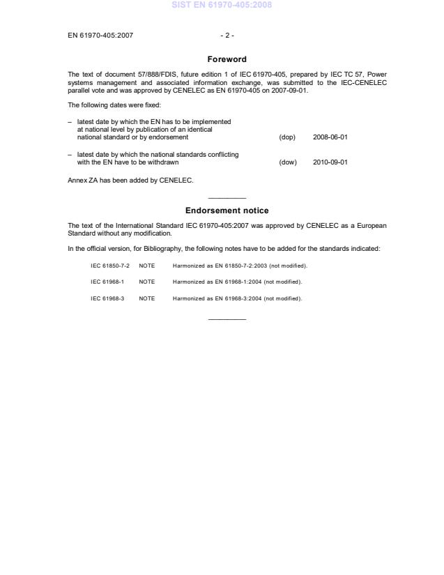 2010-09-01 Annex ZA has been added by CENELEC. __________ Endorsement notice The text of the International Standard IEC 61970-405:2007 was approved by CENELEC as a European Standard without any modification. In the official version, for Bibliography, the following notes have to be added for the standards indicated: IEC 61850-7-2 NOTE Harmonized as EN 61850-7-2:2003 (not modified). IEC 61968-1 NOTE Harmonized as EN 61968-1:2004 (not modified). IEC 61968-3 NOTE Harmonized as EN 61968-3:2004 (not modified). __________ SIST EN 61970-405:2008