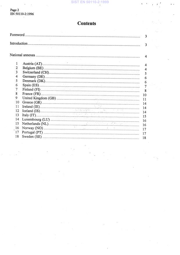 The standard consists of two parts. The first part EN 50110-1 contains Minimum Requirements valid for all CENELEC countries and some additional informative annexes dealing with safe working. The second part EN 50110-2 consists of a set of normative annexes (one per country) which specify either the present safety requirements or give the national supplements to these Minimum Requirements at the time when this standard was prepared. The national annexes (if any) are summarized by the respective member country. National Committees shall notify CENELEC of any changes needed to their national annex