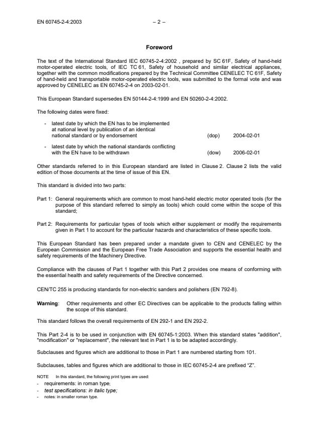 Foreword The text of the International Standard IEC 60745-2-4:2002 , prepared by SC 61F, Safety of hand-held motor-operated electric tools, of IEC TC 61, Safety of household and similar electrical appliances, together with the common modifications prepared by the Technical Committee CENELEC TC 61F, Safety of hand-held and transportable motor-operated electric tools, was submitted to the formal vote and was approved by CENELEC as EN 60745-2-4 on 2003-02-01. This European Standard supersedes EN 50144-2-4:1999 and EN 50260-2-4:2002.