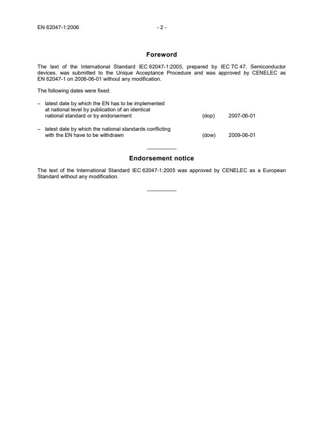 Foreword The text of the International Standard IEC 62047-1:2005, prepared by IEC TC 47, Semiconductor devices, was submitted to the Unique Acceptance Procedure and was approved by CENELEC as EN 62047-1 on 2006-06-01 without any modification. The following dates were fixed: – latest date by which the EN has to be implemented