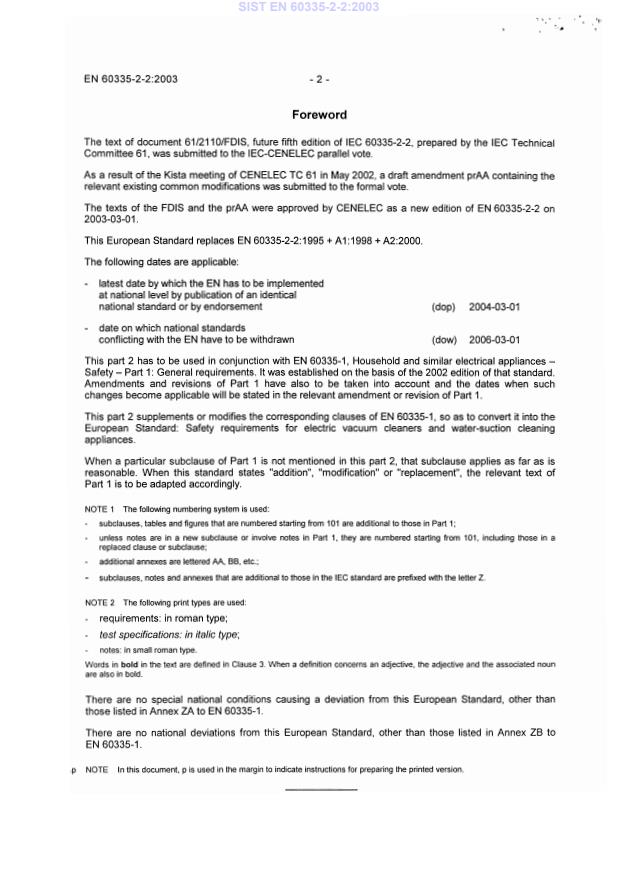 EN 60335-2-2:2003 is a standard published by CLC. Its full title is "Household and similar electrical appliances - Safety - Part 2-2: Particular requirements for vacuum cleaners and water-suction cleaning appliances". This standard covers: Deals with the safety of electric vacuum cleaners and water-suction cleaning appliances. It also applies to motorized cleaning heads and current-carrying hoses for vacuum cleaners. These are for household use, including vacuum cleaners for animal grooming. The rated voltage is less than 250 V. This standard does not cover industrial appliances, nor special conditions such as explosive atmospheres.