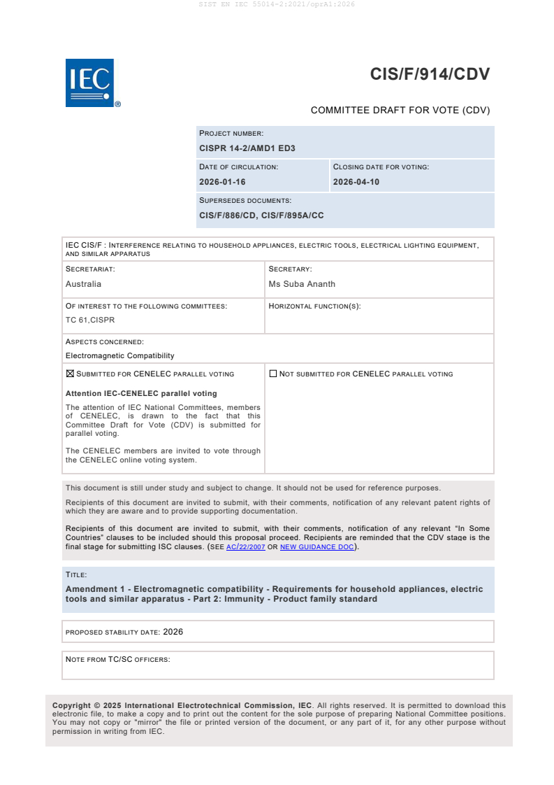 EN IEC 55014-2:2021/prA1:2026 is an important amendment published by CLC under the IEC framework. This standard focuses on electromagnetic compatibility (EMC) immunity requirements for household appliances, electric tools, and similar apparatus. As a product family standard, it specifies updated immunity test procedures and performance criteria to ensure that electrical products used in residential and similar environments can withstand electromagnetic disturbances without significant degradation of function.